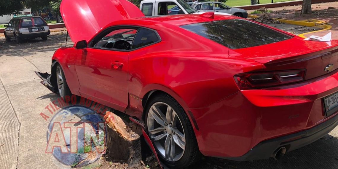 Tapachula, Chiapas. El conductor de un Camaro se impactó contra un tronco y le causó daños a su carrocería, en la 3a avenida sur entre 22a y 24a calle oriente, colonia Benito Juárez.