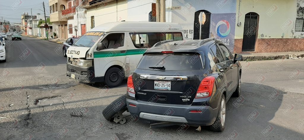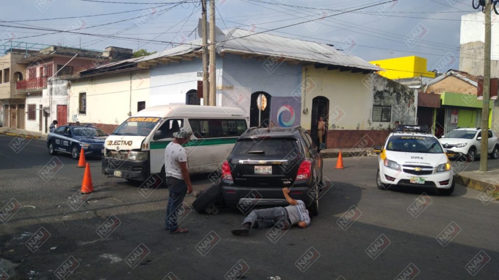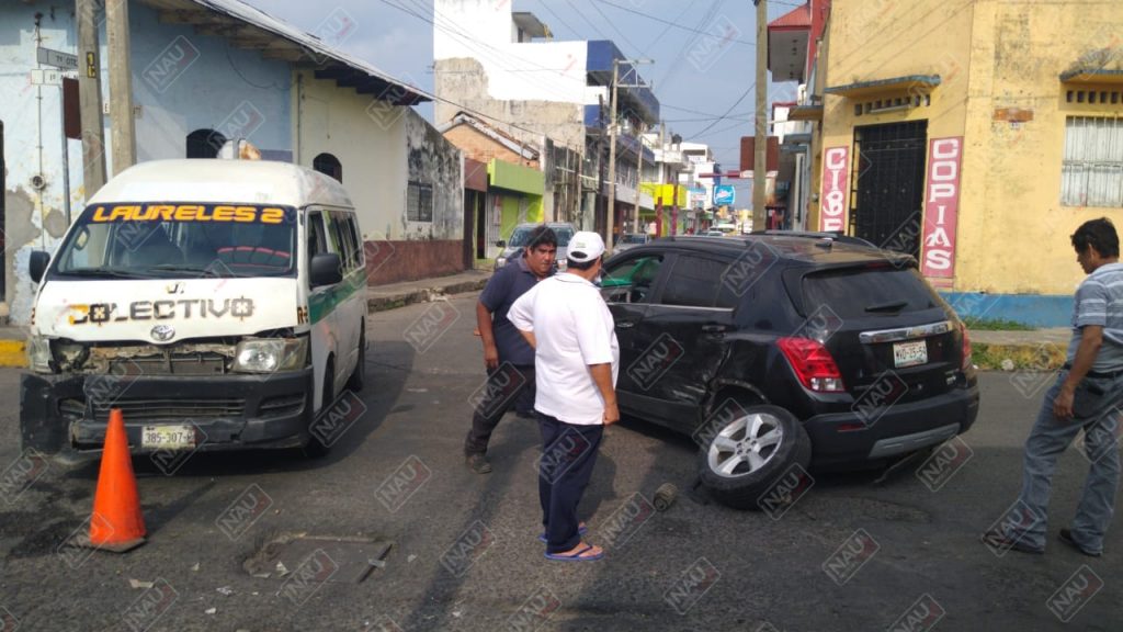 Tapachula, Chiapas. El conductor de una combi de pasaje y una camioneta Chevrolet Trax, chocaron sobre la 1a avenida norte, esquina con la 7a calle oriente, por fortuna nadie resultó lesionado.