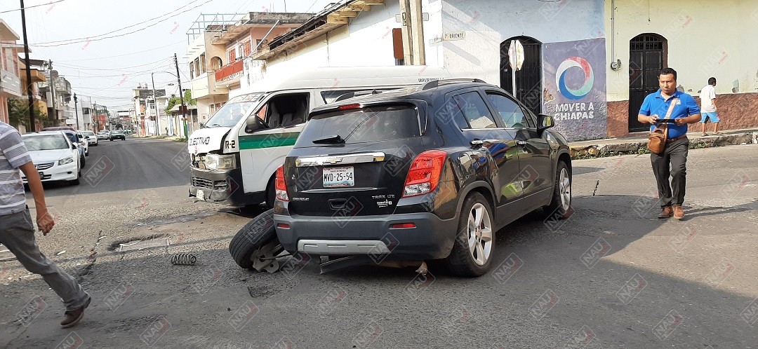 Tapachula, Chiapas. El conductor de una combi de pasaje y una camioneta Chevrolet Trax, chocaron sobre la 1a avenida norte, esquina con la 7a calle oriente, por fortuna nadie resultó lesionado.