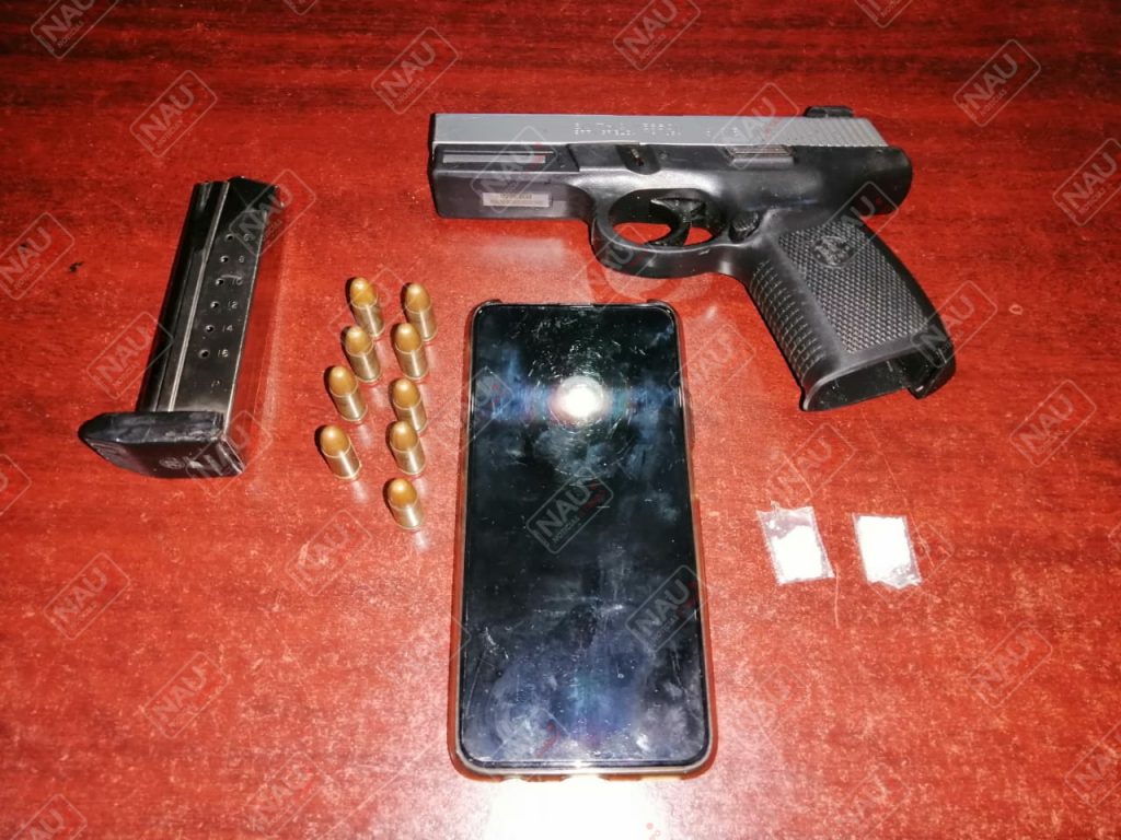 Al aplicarle una revisión, dentro del vehículo Chevrolet tipo Malibú con placas del estado de Tlaxcala, se lo encontró un arma calibre 9 milímetros, con su cargador abastecido con 7 cartuchos del mismo calibre, asimismo dos bolsitas de cocaína que llevaba entre su pantalón.