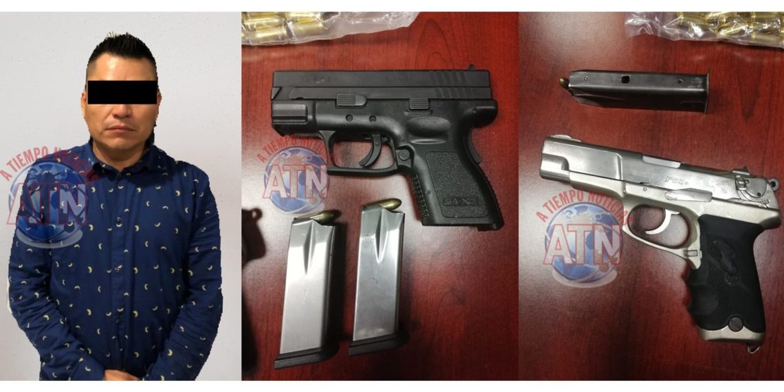 TAPACHULA, CHIAPAS. Una persona que llevaba dos pistolas abastecidas con sus cartuchos útiles en su cargador y una bolsa con 100 balas del calibre 9 milímetros, fue detenido por elementos de la policía de la fiscalía de alto impacto, fiscalía de abigeato y policía fronteriza.