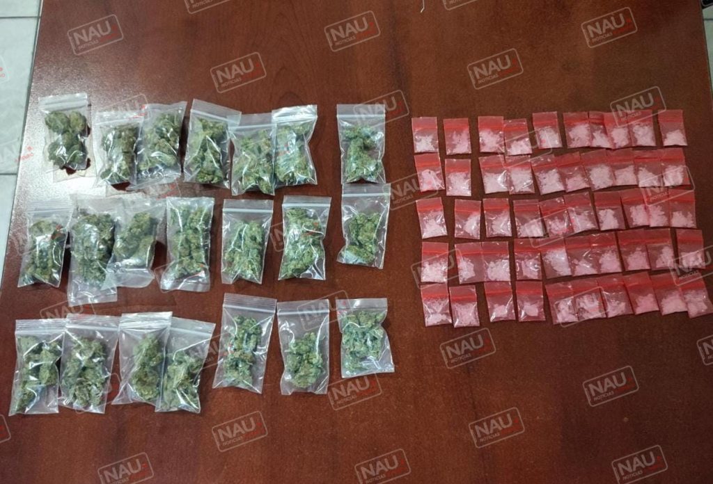 Al aplicar una revisión, se le localizó 21 bolsitas de plástico transparente conteniendo una sustancia color verde con las características de la marihuana, 50 bolsitas de sustancia cristalina conocida como droga sintética como cristal.