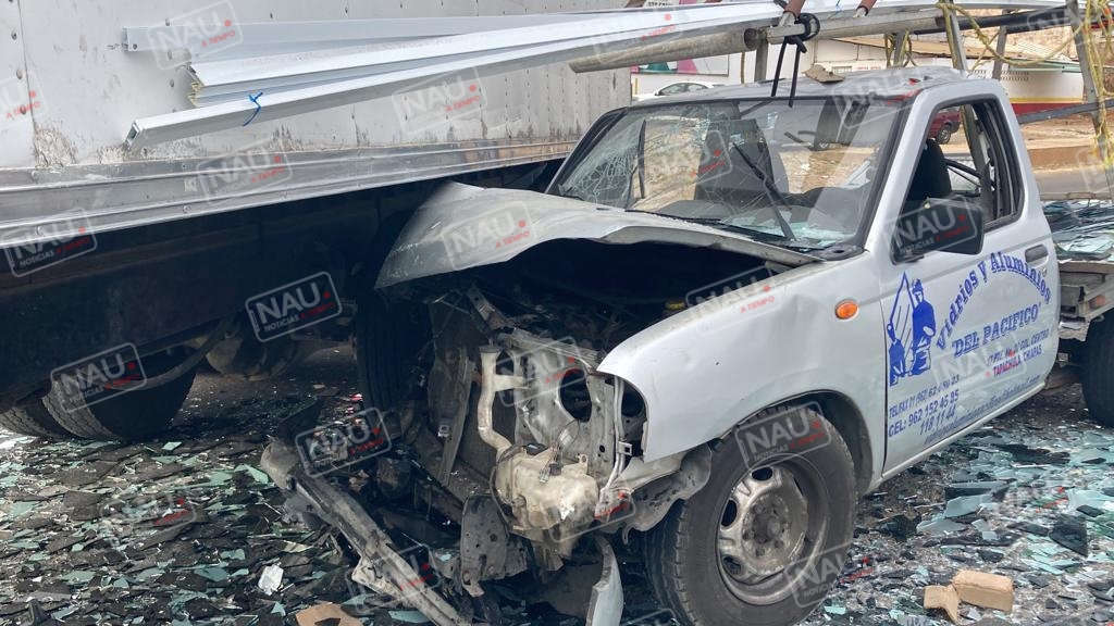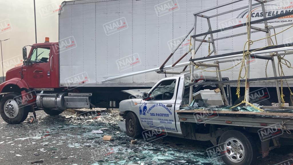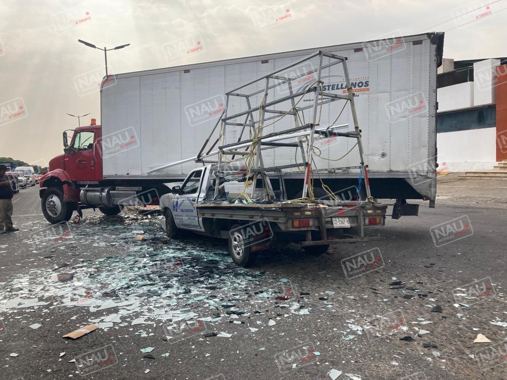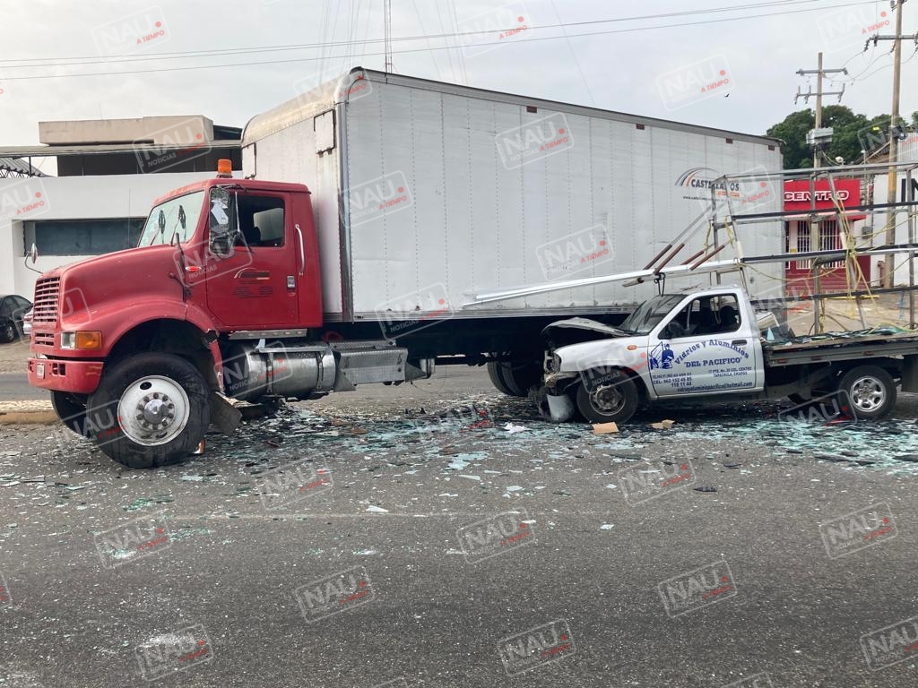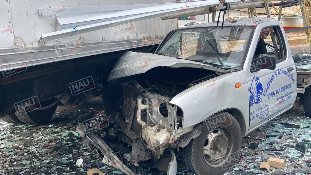 El conductor de la camioneta estaquita de color plata con plataforma de la empresa vidrios y aluminios del Pacífico, se impactó en el costado izquierdo del camión.