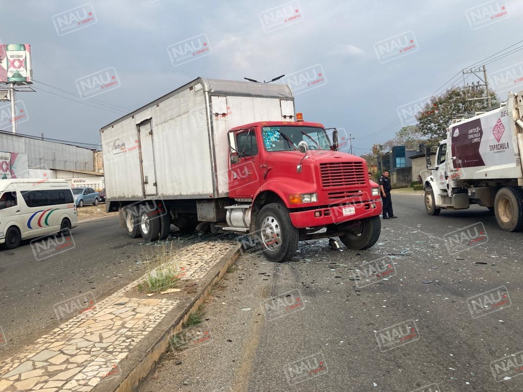 Tapachula, Chiapas. El conductor de un camión torton con caja seca, hizo corte de circulación a un vehículo de una empresa de venta de vidrios, sobre la carretera Tapachula – Huixtla, a la altura de reconocida empresa cervecera.