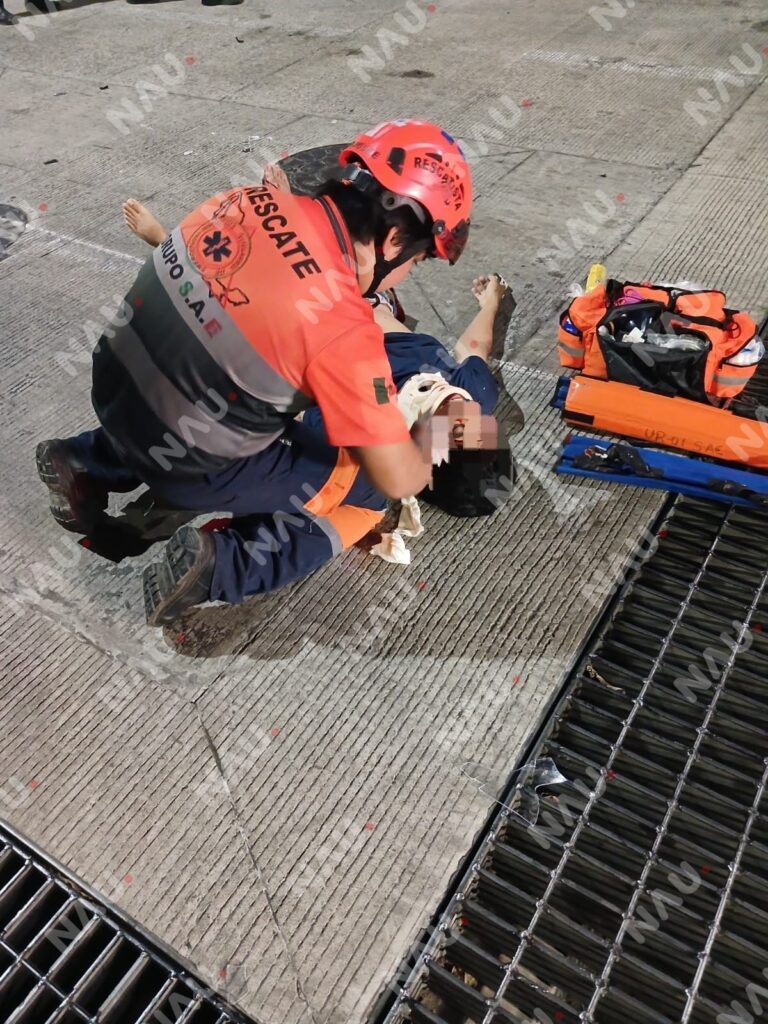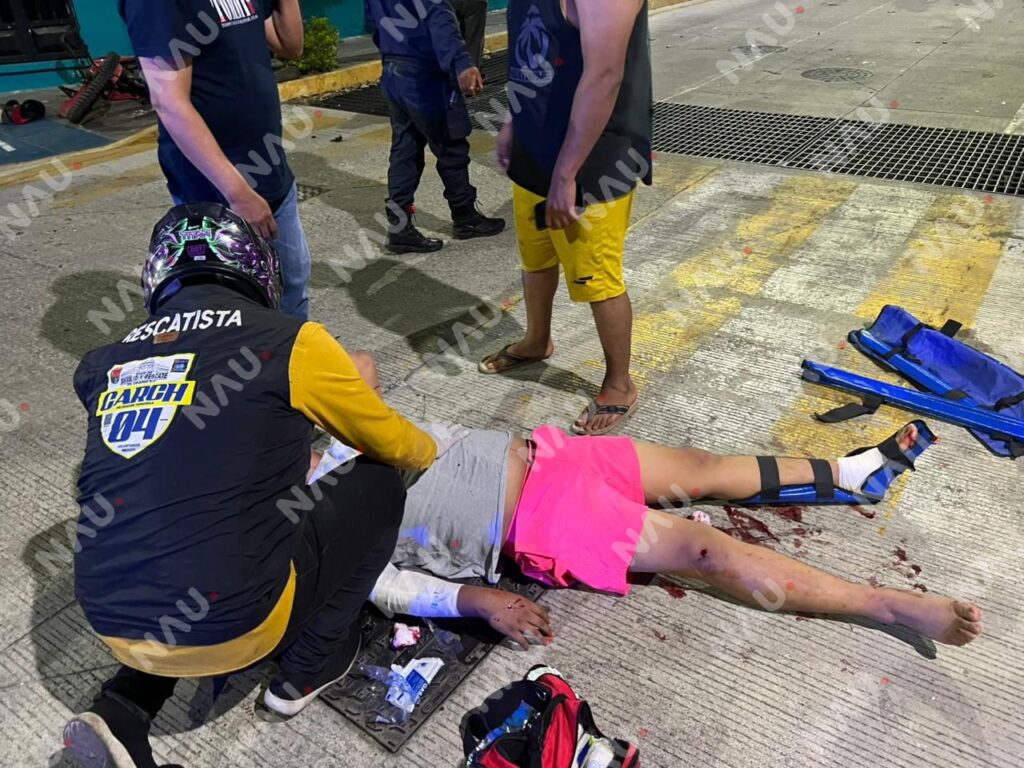 Tapachula, Chiapas.— Minutos antes de la medianoche de este domingo 25 de enero de 2026, se registró un aparatoso accidente vehicular en la intersección de la 5ª avenida Norte y 7ª calle Oriente, que dejó como saldo a dos motociclistas gravemente lesionados y cuantiosos daños materiales.