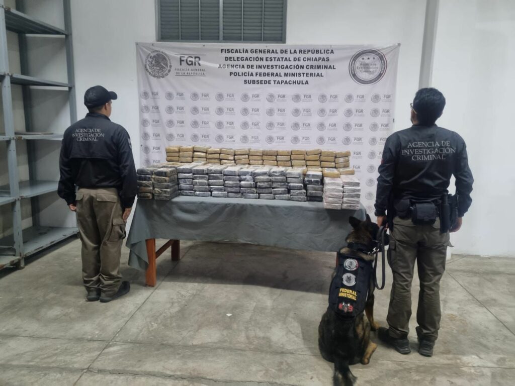 Lo anterior derivado de la cumplimentación de una orden de cateo, que fue autorizada por el Juez de Control del Centro de Justicia Penal Federal y ejecutada por elementos de la Policía Federal Ministerial (PFM) de la Agencia de Investigación Criminal, con el apoyo de la Secretaría de la Defensa Nacional (SEDENA), en un inmueble que se ubica en la colonia 5 de Febrero, en Tapachula, Chiapas, que fungía como una bodega.