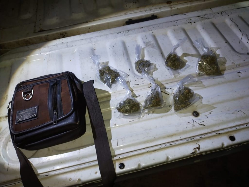 Durante la inspección de rutina, los elementos policíacos encontraron entre las ropas de los detenidos, siete bolsas de plástico transparente, con hierba seca color verde con las características propias de la marihuana.