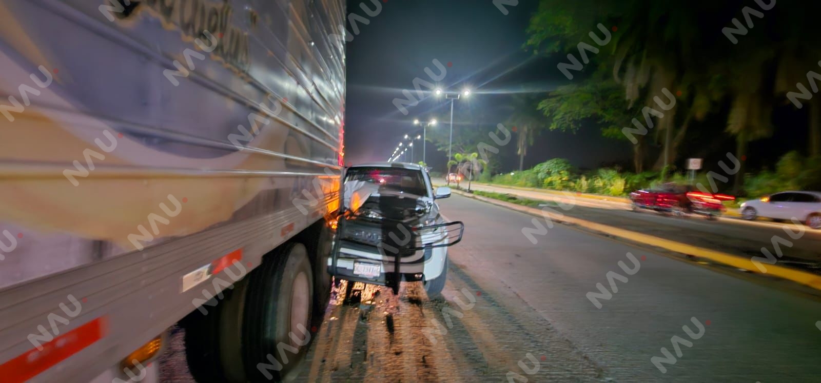 Tapachula, Chiapas. – La noche de este sábado se registró un accidente vehicular sobre el libramiento Sur Poniente, a unos 100 metros de la entrada al camino viejo a Mazatán, donde una camioneta de la marca JMC se impactó por alcance contra la parte trasera de un tráiler.