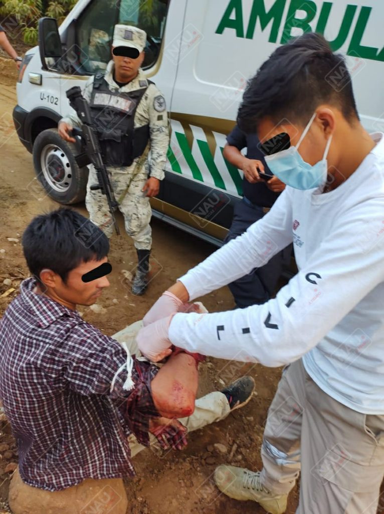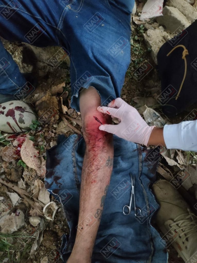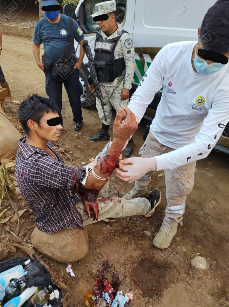 Al lugar arribaron elementos de la guardia nacional, Policía municipal y protección civil, quienes tuvieron a la vista dos personas del sexo masculino, quienes presentaban heridas por arma blanca, uno en la pierna derecha y el otro en la mano izquierda.