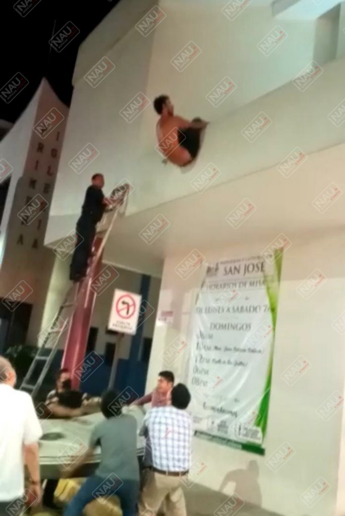 El migrante de nombre Roberto N., quien no está enfermo de sus facultades mentales, solo problemas para hablar, amenazaba con arrojarse de la planta alta de la iglesia, pero en la parte baja vecinos y elementos de la Policía Municipal colocaron colchones, aún así se aventó de espalda para quitarse la vida.
