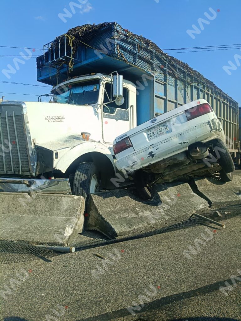 El percance involucró a un Nissan Tsuru de color blanco y un camión tipo Torton que transportaba material vegetal. A consecuencia del impacto, el vehículo particular quedó incrustado sobre los bloques de concreto que dividen los carriles de la vía, presentando severos daños en su estructura.