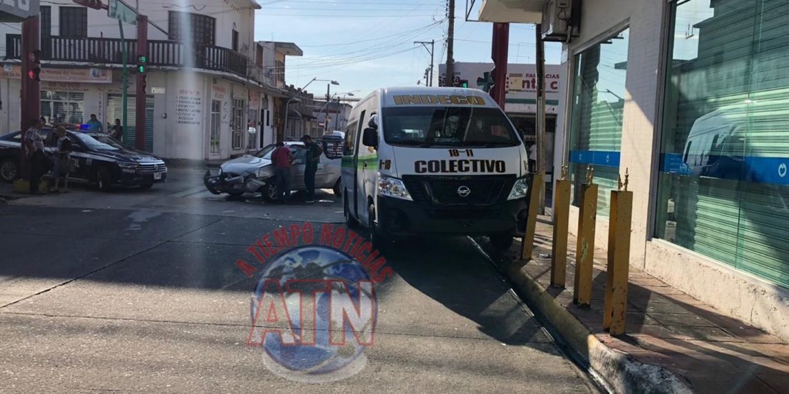 Tapachula, Chiapas. Sólo daños materiales fue saldo de un accidente entre un automóvil y una Combi colectiva, los hechos se suscitaron en la central avenida norte y esquina con la 9a calle oriente poniente, lugar en donde intervino la policía estatal de tránsito.