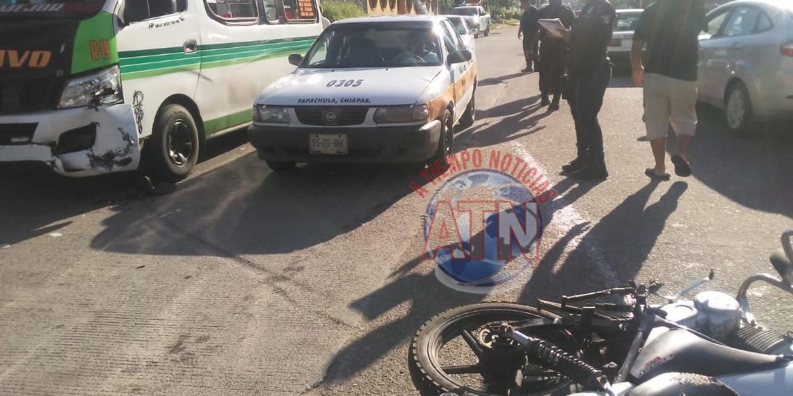 TAPACHULA, CHIAPAS. Un Señor de la tercera edad, que viajaba en una motocicleta, resultó con lesiones al ser impactado por una combi colectiva.