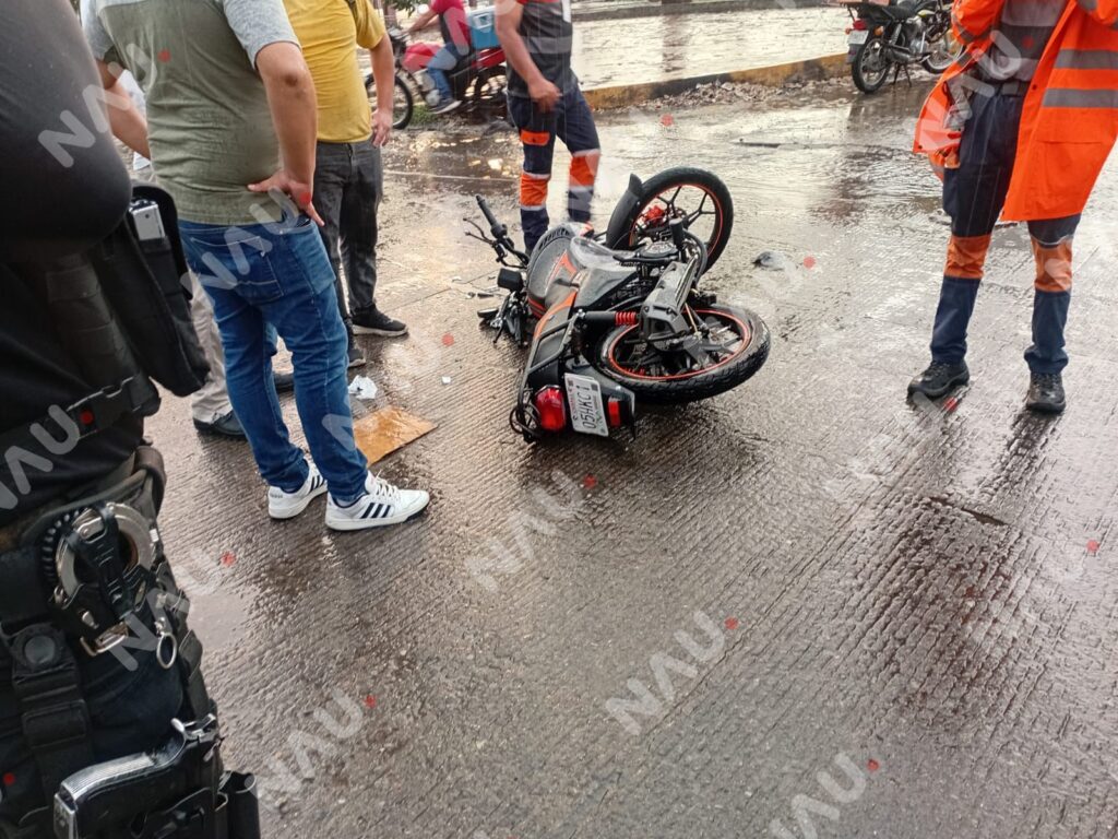 Tapachula, Chiapas; 4 de abril de 2026.– Un accidente entre una motocicleta y una camioneta dejó como saldo a un joven lesionado la tarde de este sábado sobre el Boulevard Akishino, a la altura del fraccionamiento Rinconada del Carmen.
