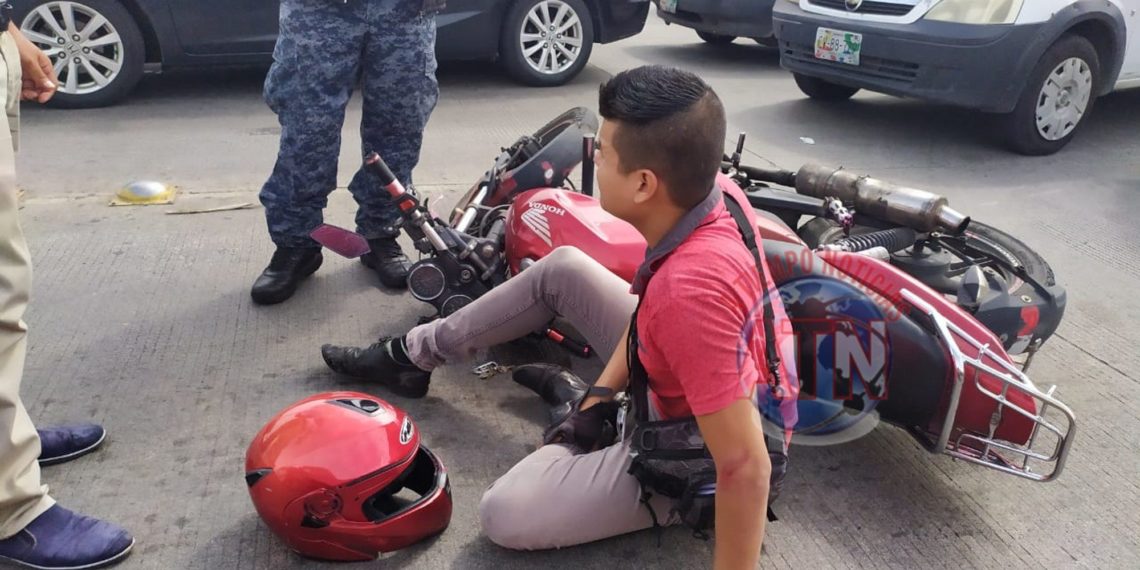 Fue en ese momento que el motociclista se impactó contra el retrovisor izquierdo y cae al pavimento, ocasionando una lesión en la pierna izquierda, paramédicos de la Cruz Roja acudieron al lugar y posteriormente le brindaron los primeros auxilios al joven motociclista.