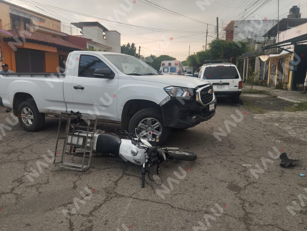 Tapachula, Chiapas.– Un accidente de tránsito ocurrido la tarde de este martes, en el cruce de la 19ª Calle Oriente y 15ª Avenida Norte, dejó como saldo a un joven motociclista lesionado, luego de que una camioneta le cortara la circulación.