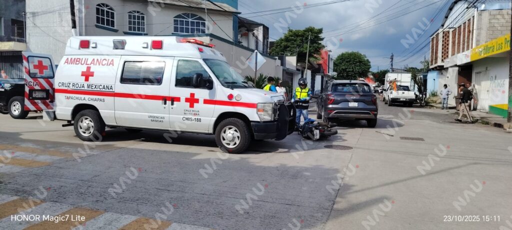 Tapachula, Chiapas; 23 de octubre de 2025. — Un motociclista resultó lesionado tras un accidente vial ocurrido la tarde de este jueves, en el cruce de la 5ª Avenida Privada Norte y 31ª Calle Oriente de Tapachula, donde la falta de señalamientos viales ha provocado múltiples percances en los últimos meses.