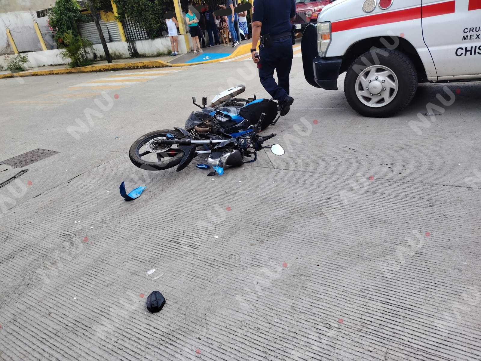 Tapachula, Chiapas; 23 de octubre de 2025. — Un motociclista resultó lesionado tras un accidente vial ocurrido la tarde de este jueves, en el cruce de la 5ª Avenida Privada Norte y 31ª Calle Oriente de Tapachula, donde la falta de señalamientos viales ha provocado múltiples percances en los últimos meses.