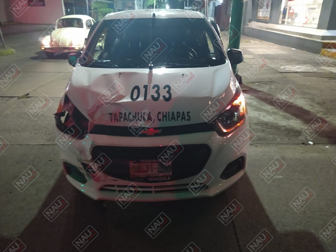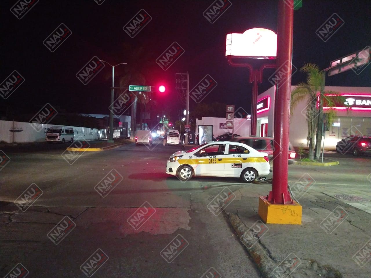 Según el conductor tenía la luz verde del semáforo y en su intento le salió de paso un vehículo Chevrolet tipo beat, de color blanco con franjas amarillas, del servicio público local habilitado como taxi, con número económico 0133, modelo 2019, conducido por Natán, quien se desplazaba de sur a norte sobre la 9a avenida norte par vial, quien también presuntamente tenía la luz verde del semáforo y en su intento, hizo qué terminara impactándose contra el costado de la unidad de pasaje.