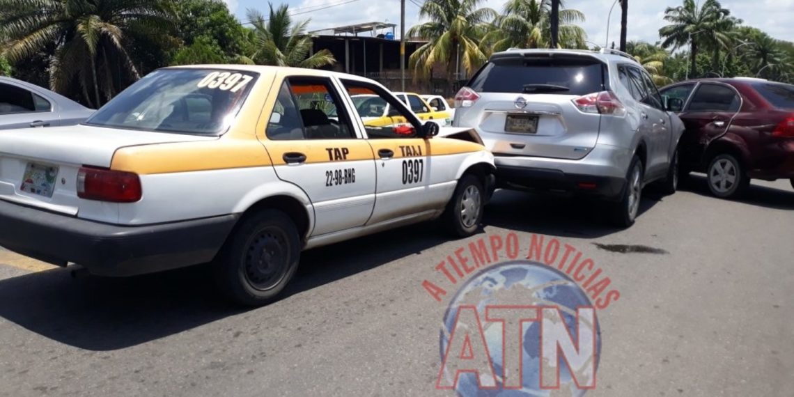 El vehículo Nissan Tsuru de color blanco con franjas amarillas, en su modalidad taxi local, con número económico 0397, el cual estaba en dirección de norte a sur sobre la calzada Manuel Velazco Suarez, había impactado contra la parte trasera de una camioneta Nissan Xtrail de color plata y la camioneta del fuerte impacto, chocó contra el costado izquierdo de un automóvil Chevrolet Aveo de color guinda.
