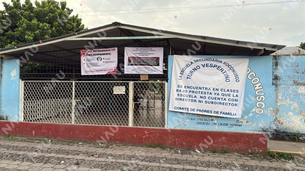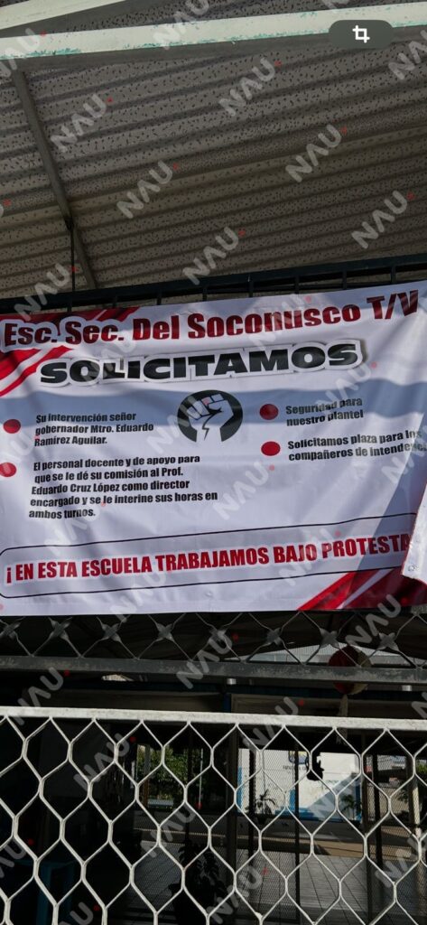 Otra de las lonas señala que la Escuela Secundaria del Soconusco turno vespertino se encuentra en clases bajo protesta, debido a la falta de autoridades directivas, hecho que ha sido respaldado por el Comité de Padres de Familia, el cual demandó que se priorice la atención a la comunidad estudiantil para no afectar el desarrollo educativo de los alumnos.