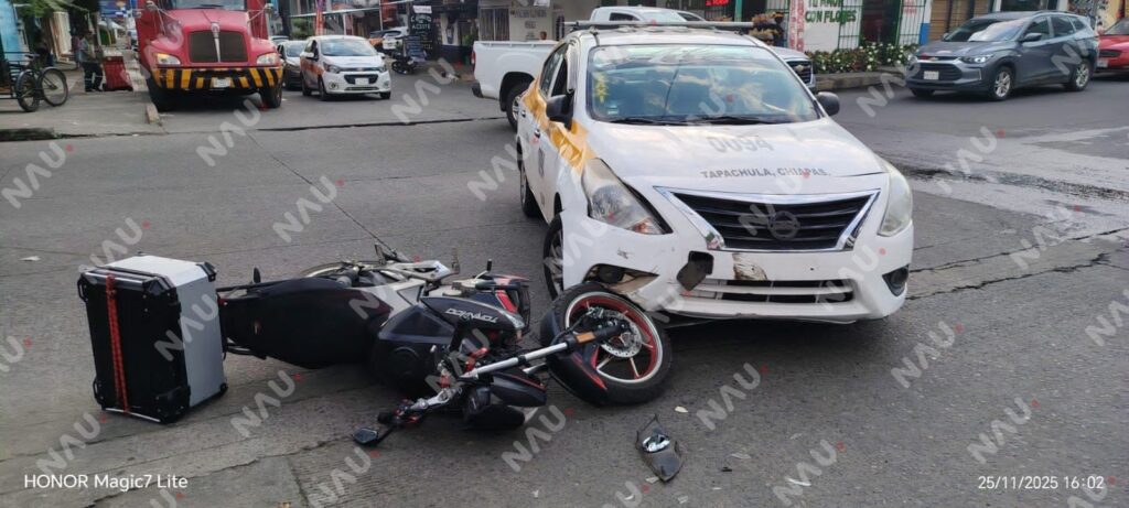 Tapachula, Chiapas.— Un choque entre una motocicleta y un taxi tipo Nissan Versa, dejó daños materiales y a uno de los involucrados sancionado, luego de un percance registrado alrededor de las 15:50 horas de este martes, en la intersección de la 11ª Avenida Sur y 28ª Calle Oriente.