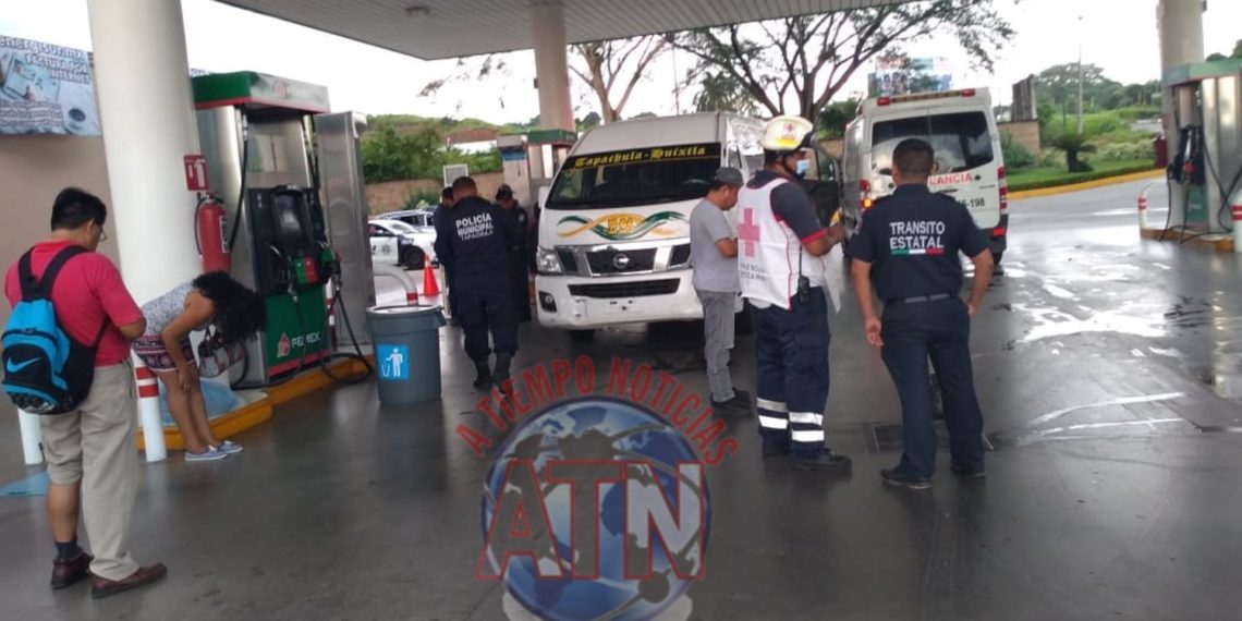 TAPACHULA, CHIAPAS. – Tres pasajeros lesionados, luego de una combi de pasaje de la Ruta Tapachula – Huixtla, chocó contra un tubo dentro de la gasolinera, al no frenar a tiempo.
