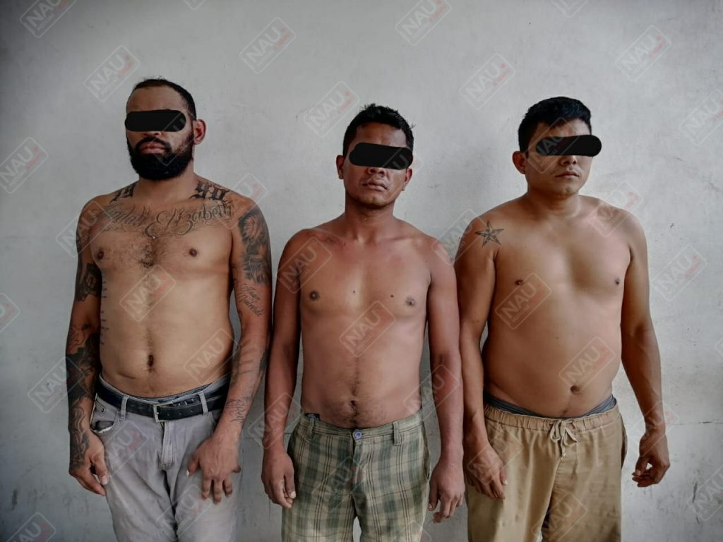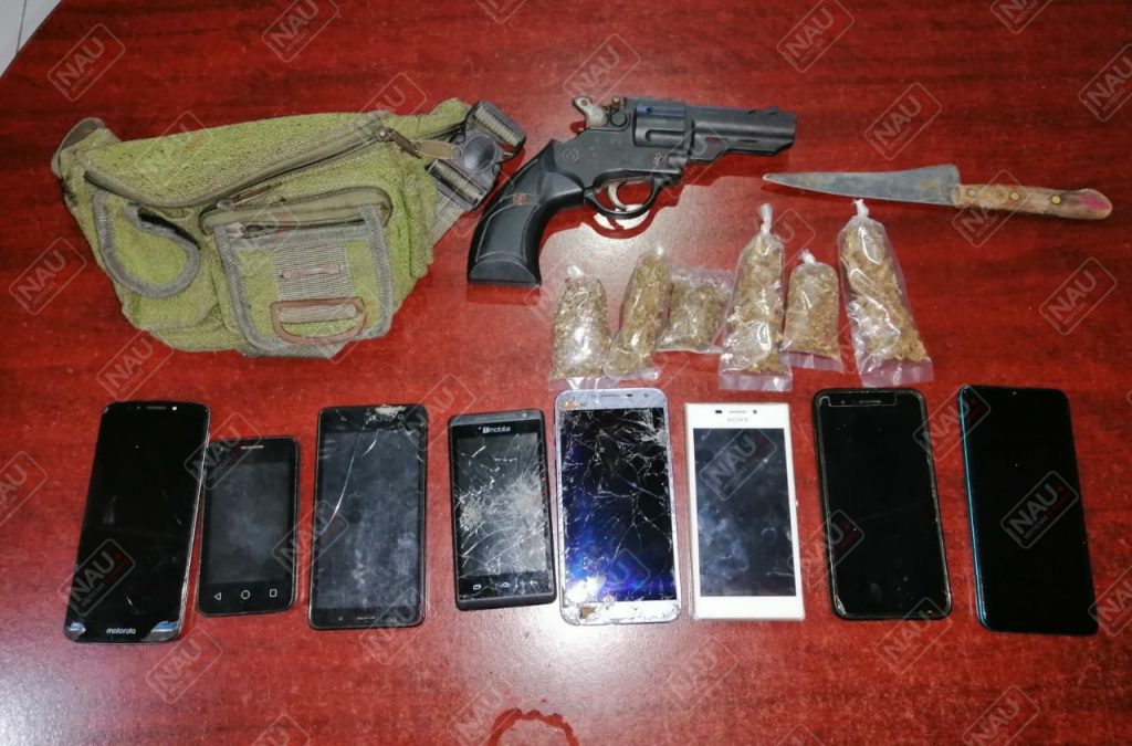 Los detenidos son Pablo Facundo N. (a) el nika, de 29 años, originario de Arriaga, se le aseguró una pistola tipo revolver, color negra, de plástico, y 02 bolsitas de plástico con marihuana, Rosendo N. (a) el perro negro, de 25 años, mexicano, se le aseguró un cuchillo, una cangurera color verde con 08 celulares y 02 bolsitas de plástico con marihuana, y Francisco Javier N. (a) el paco, de 26 años, mexicano, chófer de la combi, a quien se le aseguró una combi de la ruta periférico izquierda, con número económico 16_09, y 02 bolsitas de plástico con marihuana.