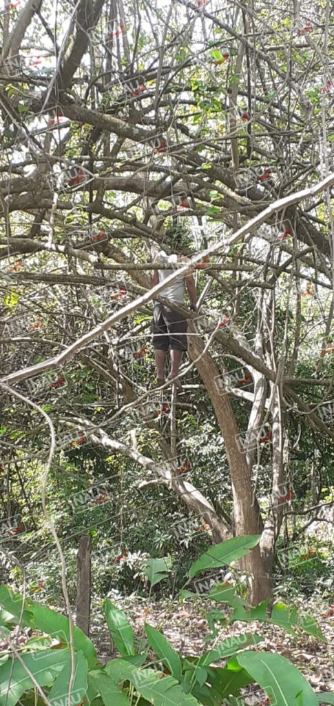 En el lugar de los hechos se localizó el cuerpo de la persona colgado en un árbol de caulote, mismo que vestía una camiseta de color gris y short de mezclilla de color negro, descalzo.