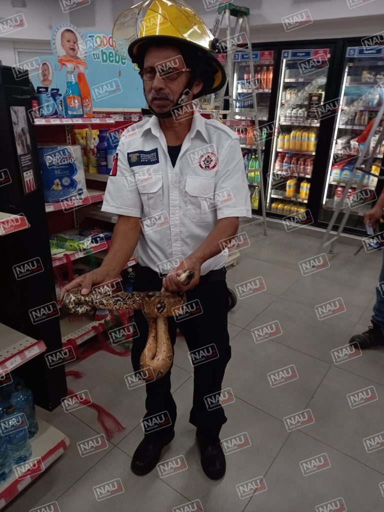 Un empleado de la empresa Oxxo, solicitó la intervención de personal del cuerpo de bomberos, ya que una serpiente se había introducido a la tienda y temían que los atacara.