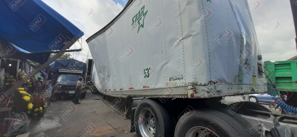 El pesado tráiler Internacional de color plata, el cual jalaba una caja seca de color blanco, se dirigía a Centroamérica, lo que ocasionó caos vial.