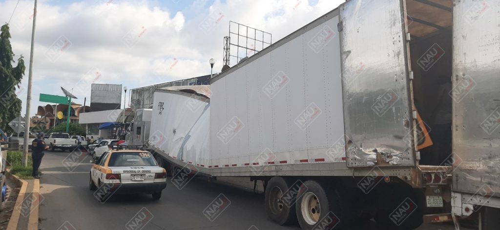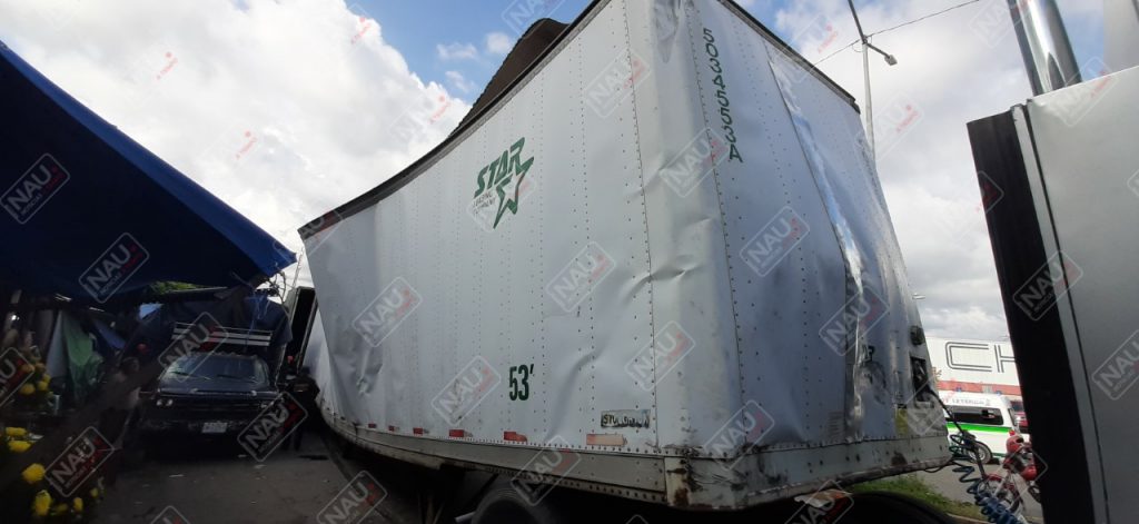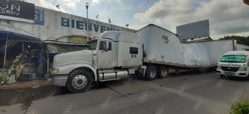 El pesado tráiler Internacional de color plata, el cual jalaba una caja seca de color blanco, se dirigía a Centroamérica, lo que ocasionó caos vial.