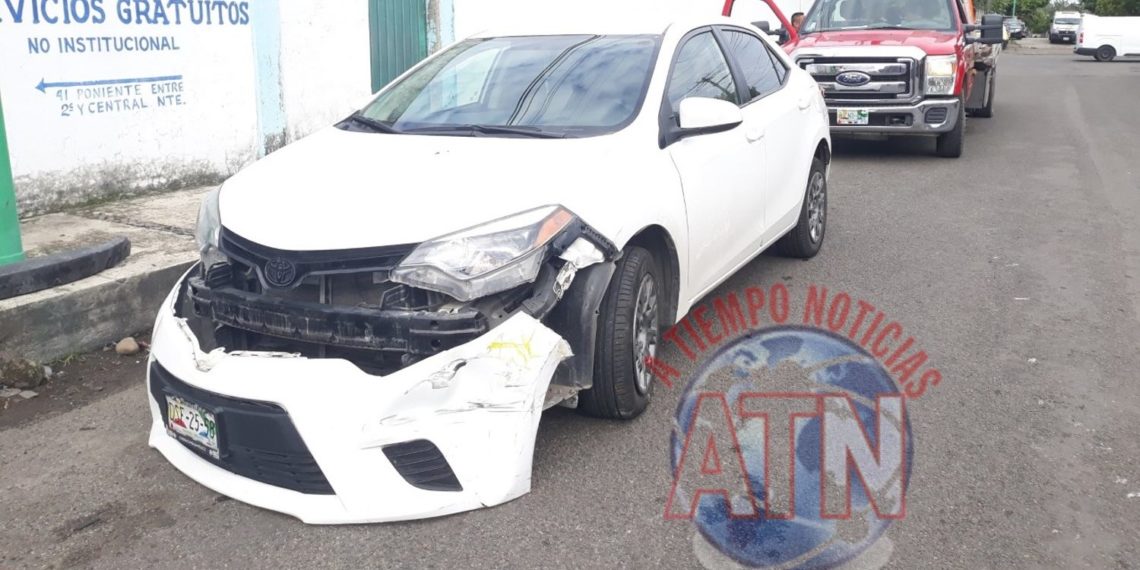 Alrededor de las 9:00 de la mañana, el vehículo Nissan Tsuru de color blanco con franjas amarillas, en su modalidad taxi local con número económico 1109, presentaba daños el costado derecho de ambas puertezuelas, mientras que automóvil Toyota Corolla de color blanco, el cual tenía desprendida la fascia delantera.