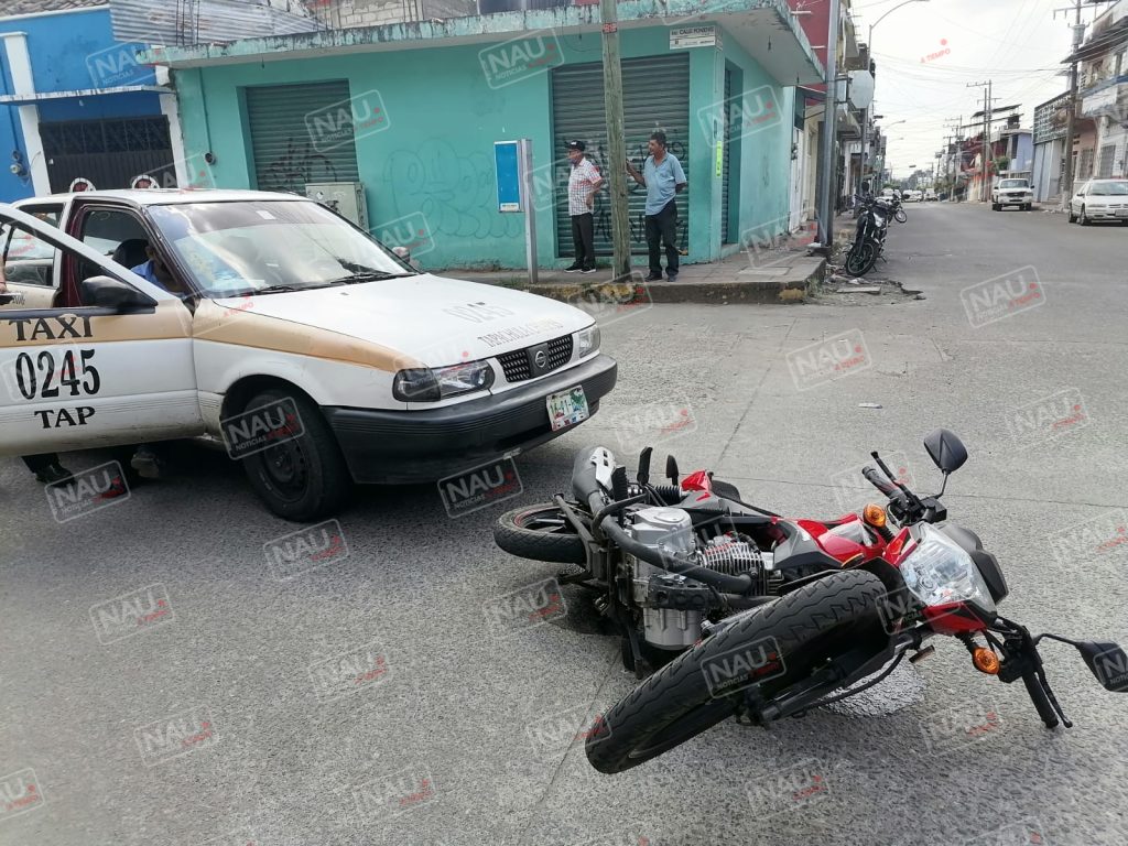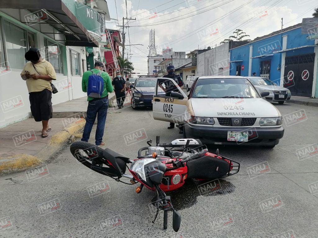 Tapachula, Chiapas. Una mujer resultó con lesiones, luego de chocar un taxi contra la motocicleta en que viajaba, sobre la segunda avenida sur y 2a calle poniente del centro de Tapachula.