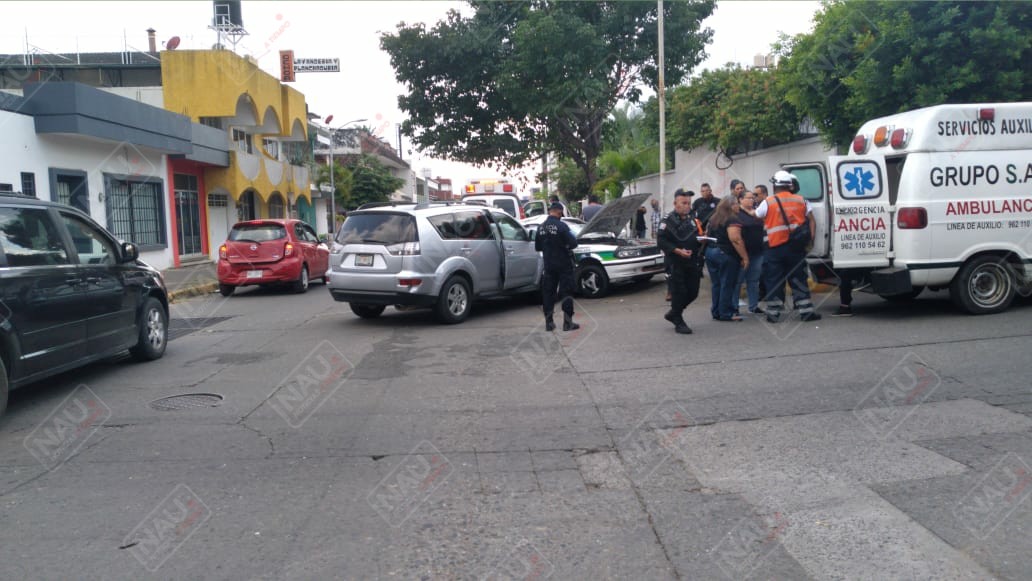 Tapachula, Chiapas.Tres personas fueron atendidas por paramédicos del grupo SAE, al chocar sobre la 19 calle oriente de la Colonia centro, entre un taxi de Puerto Madero que no respertó la preferencia y fue chocado por un vehículo con placas particulares.