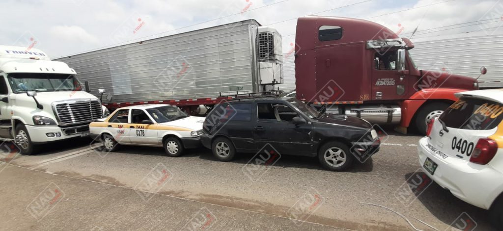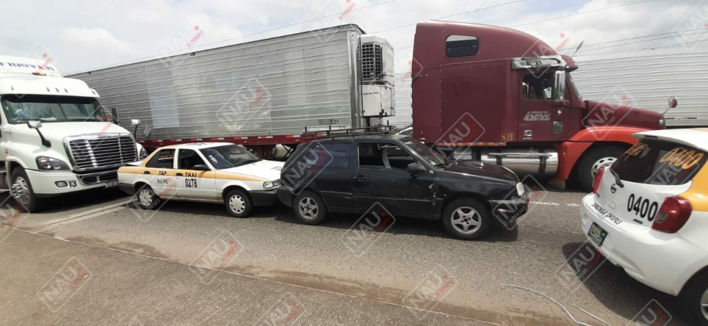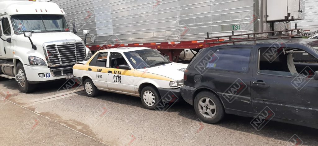 Tapachula, Chiapas. El conductor de un pesado tráiler terminó impactándose contra la parte trasera de un taxi, después de chocar contra un particular y por último el vehículo particular impactándose contra otro taxi local.