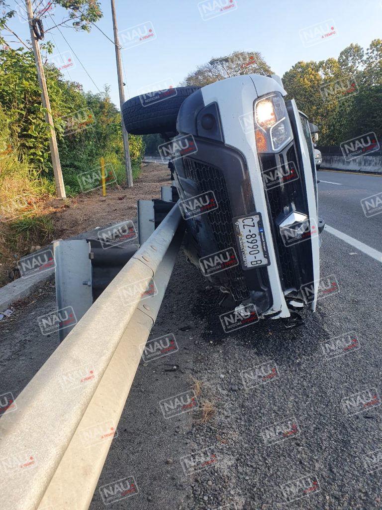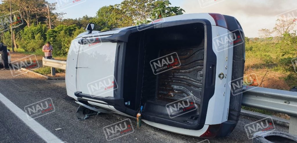 Huehuetán. Chiapas. La volcadura de un vehículo se registró sobre el tramo carretero federal Huixtla – Huehuetán, a la altura del kilómetro 265+200, donde el conductor de la camioneta Renault Duster perdió el control del volante.