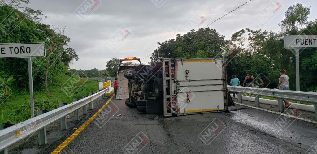 Mapastepec, Chiapas. Un vehículo de 3 toneladas cargado de harina, terminó volcado sobre la carretera Mapastepec – Tapachula.