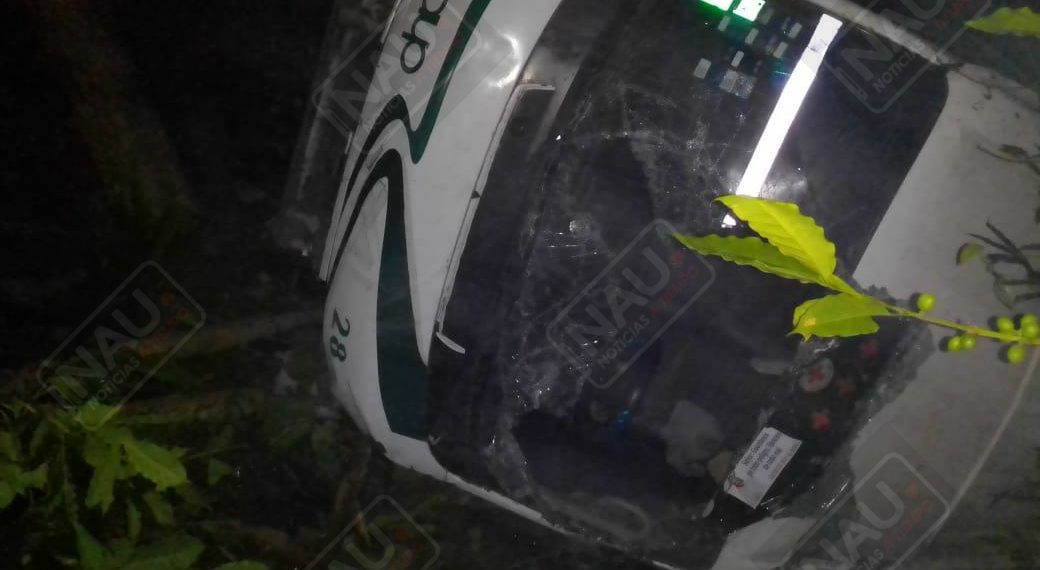 Unión Juárez, Chiapas. Dos personas resultaron con lesiones, luego de que una combi terminó volcada en un barranco, sobre la carretera Unión Juárez – Cacahoatán.