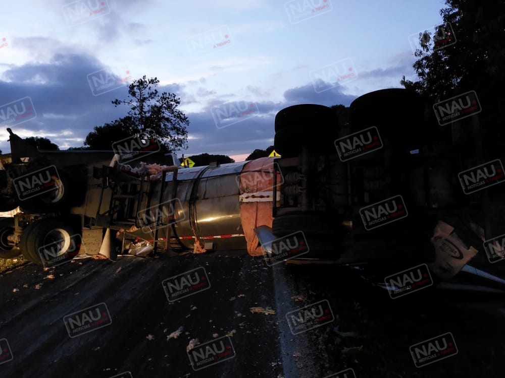 Acacoyagua, Chiapas. La tarde de este lunes, un tráiler se volcó en el tramo Federal de Escuintla a Mapastepec, a la altura del kilómetro 207.
