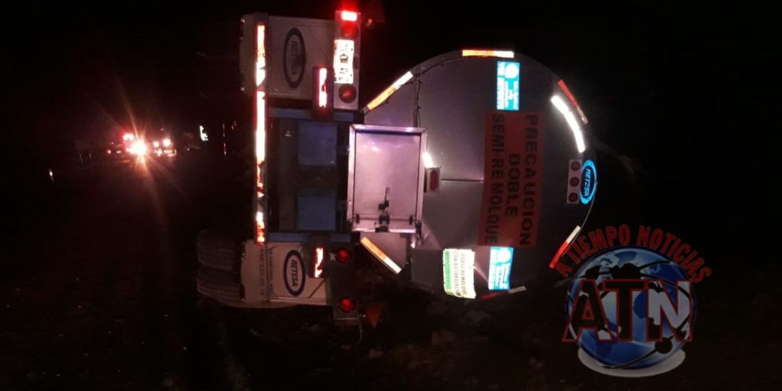El conductor del tráiler tipo pipa se orilló mucho y el último remolque lo dominó y terminó volcado, por fortuna solo daños materiales por varios miles de pesos.