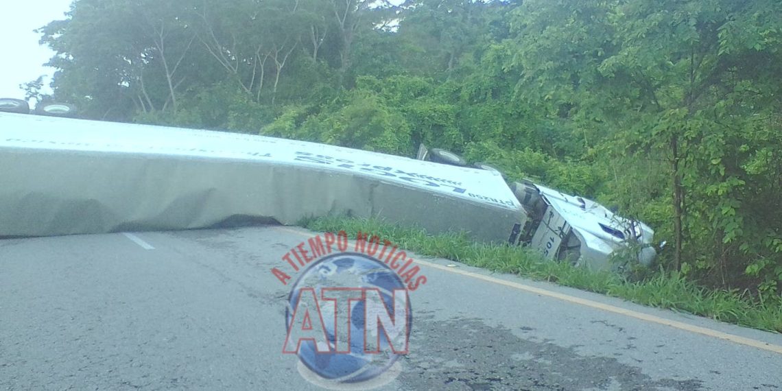 El percance se registró la mañana de este domingo, frente al rancho California, donde el conductor del tráiler de empresas logis exprés, perdió el control del volante y terminó volcado, para después retirarse del lugar.