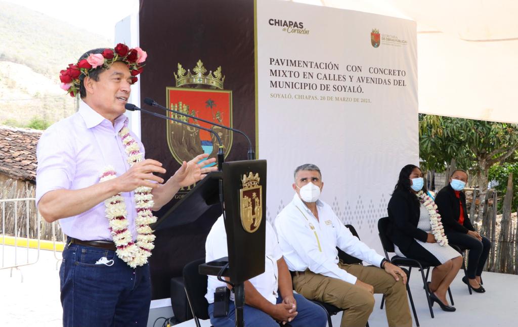 En Chiapas se trabaja de manera honesta, consciente y con lealtad al pueblo, por eso los recursos públicos están alcanzando para ejecutar obras que, además de brindar satisfacción a la gente para que viva bien y con dignidad, aportan al crecimiento, desarrollo y bienestar de las comunidades, expresó el gobernador Rutilio Escandón Cadenas al inaugurar la pavimentación con concreto mixto de calles en el municipio de Soyaló.