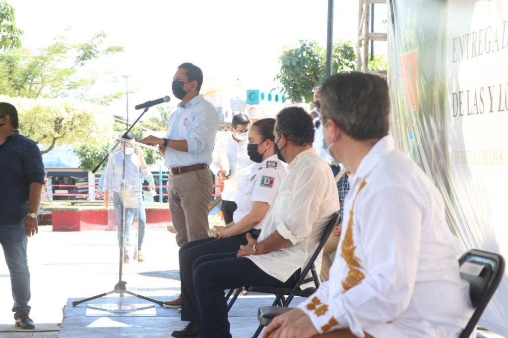 Acompañado por Ismael Brito Mazariegos, secretario de Gobierno; José Luis Laparra Calderón, presidente municipal de Huixtla; Sergio Alejandro Aguilar Rivera, secretario Ejecutivo del Sistema Estatal de Seguridad Pública; y Gabriela del Socorro Zepeda Soto, secretaria de Seguridad y Protección Ciudadana, Llaven Abarca mencionó que la Federación y el Estado tienen como prioridad implementar acciones focalizadas en cada una de la regiones de la entidad en materia de prevención y combate de conductas delictivas.