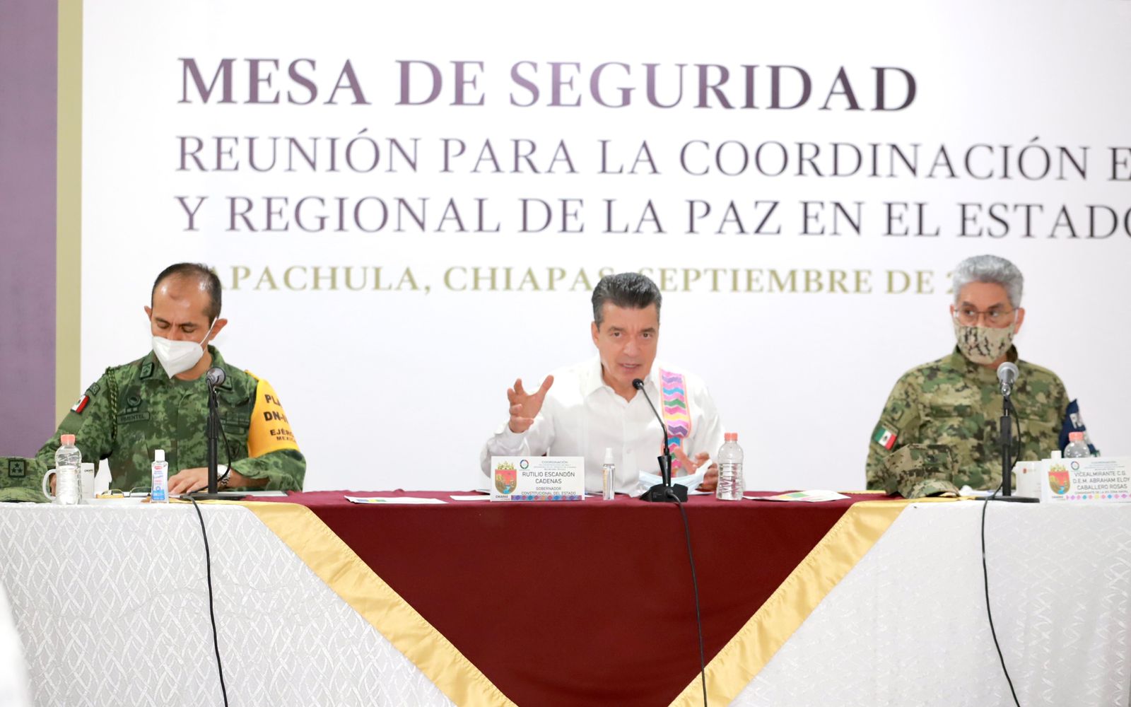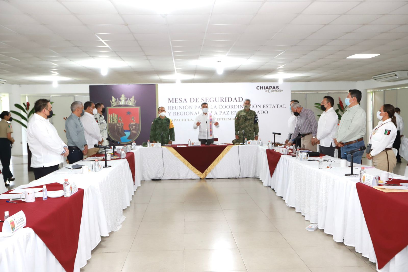 Estuvieron presentes: el secretario técnico de la Mesa de Coordinación Estatal para la Construcción de la Paz y Seguridad en Chiapas, José Francisco Trujillo Ochoa; las secretarias general de Gobierno, Victoria Cecilia Flores Pérez y de Seguridad y Protección Ciudadana, Gabriela Zepeda Soto; el fiscal general del Estado, Olaf Gómez Hernández; el secretario de Protección Civil, Luis Manuel García Moreno, el presidente de la Comisión Estatal de los Derechos Humanos, Juan José Zepeda Bermúdez; el titular del Poder Judicial, Juan Óscar Trinidad Palacios; Víctor Manuel Acosta Flores, representante de la Delegación de la Fiscalía General de la República; el delegado de Programas Integrales de Desarrollo en Chiapas, José Antonio Aguilar Castillejos.