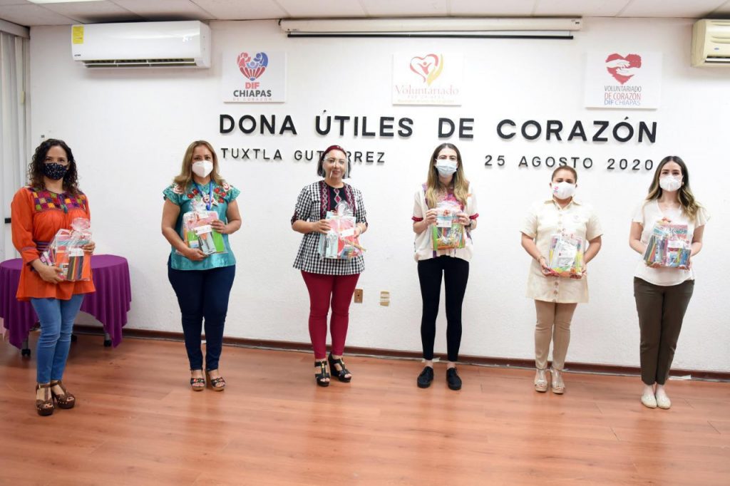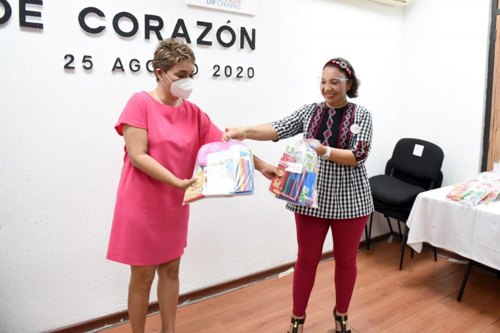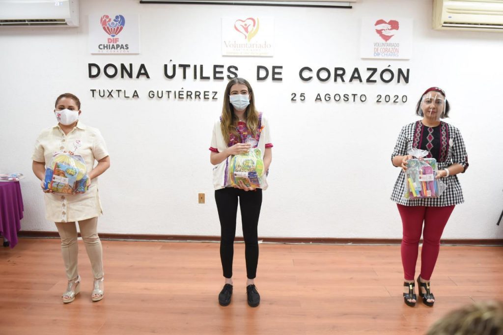 Tuxtla Gutiérrez, Chiapas.- Con la noble finalidad de contribuir en la educación de la niñez chiapaneca, la presidenta del Voluntariado de la Fiscalía General del Estado “Siempre al lado de la gente”, Guadalupe Gómez Casanova, entregó la donación de 100 paquetes de útiles escolares a niños y niñas de escasos recursos, sumándose así a la campaña Dona tus útiles de corazón, tus útiles aún son útiles” del Voluntariado de Corazón del Sistema DIF Chiapas que preside Rosalinda López Hernández.