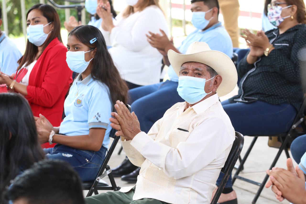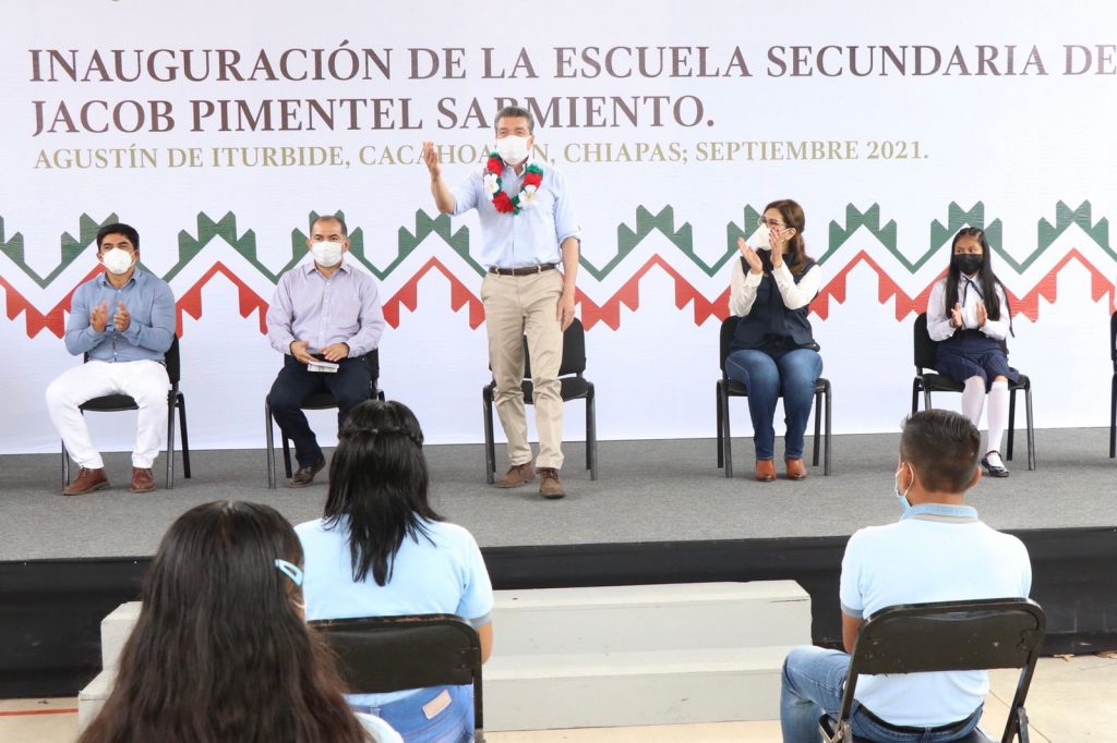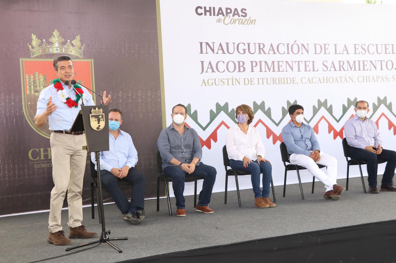 Al inaugurar cuatro aulas didácticas, laboratorio, biblioteca, obras de servicios y de exterior, y el equipamiento de la Escuela Secundaria “Jacob Pimentel Sarmiento”, en el Ejido Agustín de Iturbide, municipio de Cacahoatán, el gobernador Rutilio Escandón Cadenas sostuvo que este gobierno trabaja con honestidad, por eso, el presupuesto alcanza para consolidar obras que permitan desarrollar actividades de enseñanza-aprendizaje en espacios seguros y dignos.