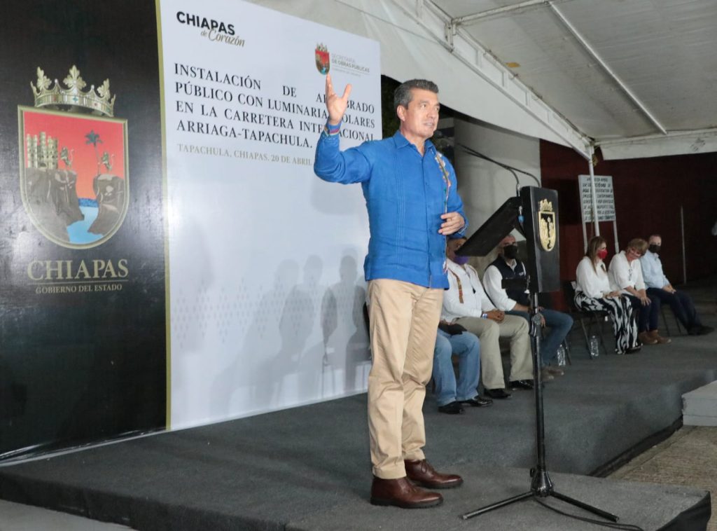 Como parte de las acciones para fortalecer la infraestructura pública de la entidad, el gobernador Rutilio Escandón Cadenas inauguró la construcción del camino Tres Picos-Estación Mojarras, en el municipio de Tonalá, calles en las colonias La Unión y Colinas del Rey de Tapachula, y la red de alumbrado público con luminarias solares en la Carretera Internacional Arriaga-Tapachula.