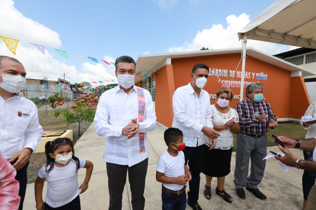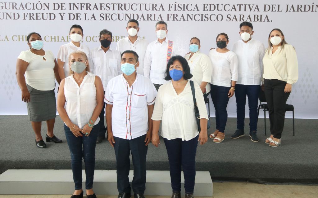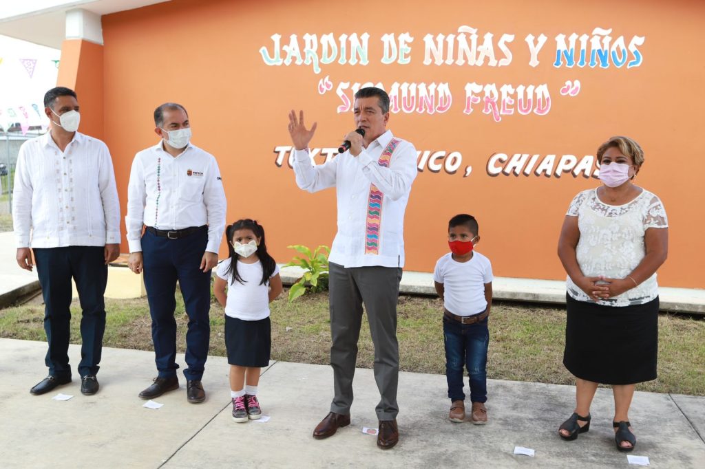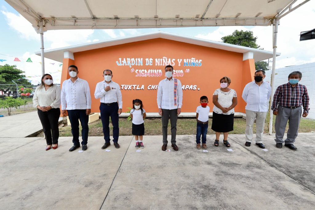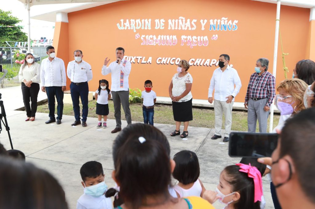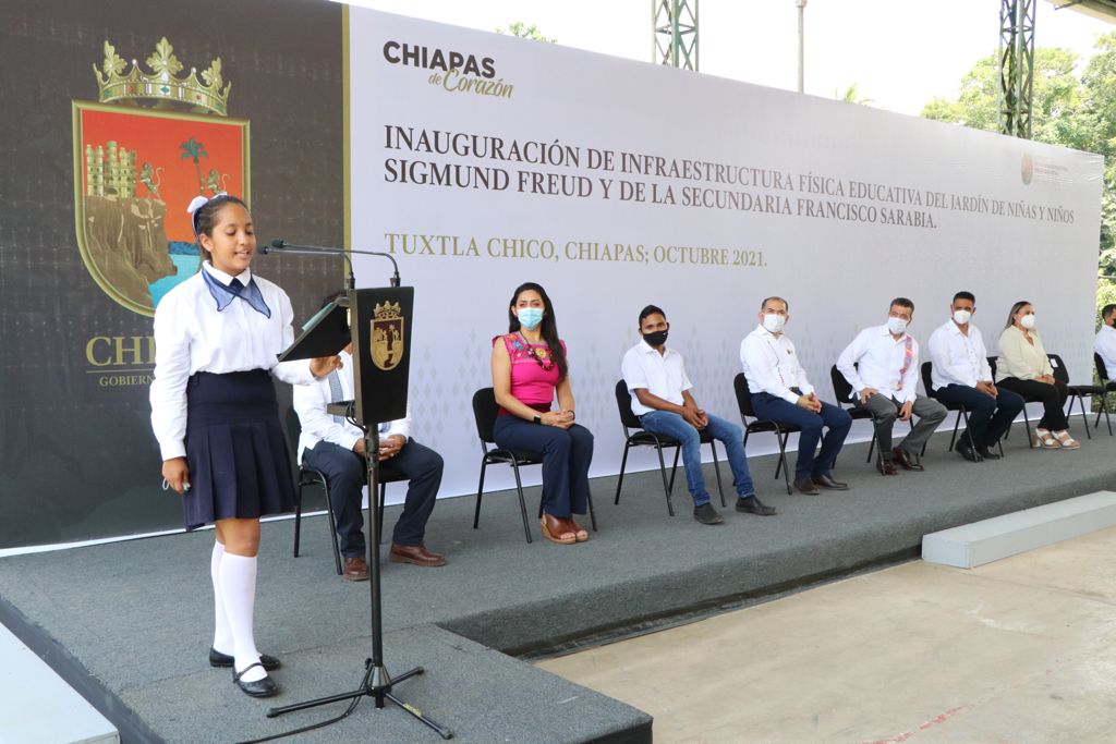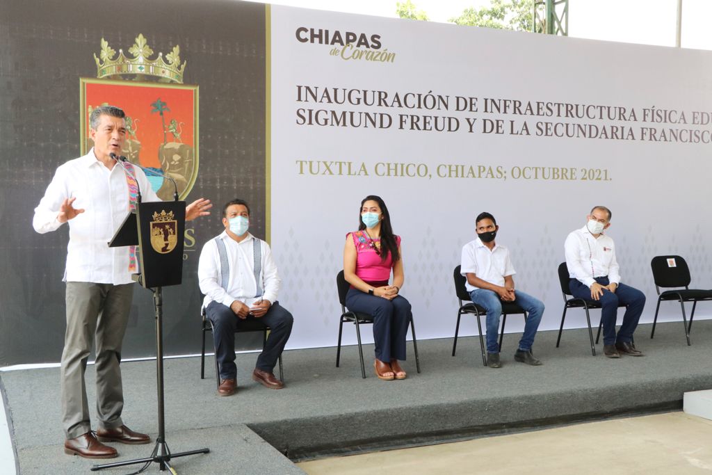El gobernador Rutilio Escandón Cadenas inauguró infraestructura educativa en el Jardín de Niñas y Niños “Sigmund Freud” y la Escuela Secundaria “Francisco Sarabia” del municipio de Tuxtla Chico, donde constató los trabajos que se realizaron para entregar espacios dignos y de calidad.