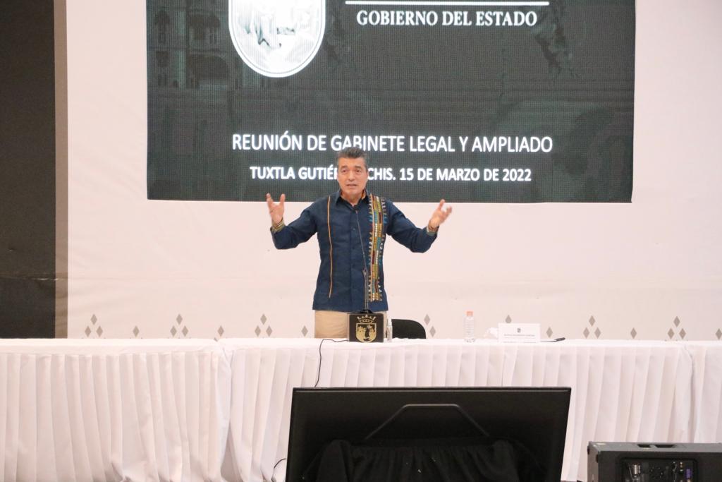 Durante la Reunión con el Gabinete Legal y Ampliado que se realiza quincenalmente a fin de dar seguimiento a los temas más relevantes en el estado, el gobernador Rutilio Escandón Cadenas mencionó que es fundamental continuar fortaleciendo el trabajo en todos los rubros, principalmente en materia de salud y protección civil, lo cual se refleja en resultados en beneficio de la vida e integridad de las familias chiapanecas.